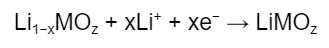 where M is a transition metal (e.g., cobalt, nickel, manganese). Lithium diffuses out of the cathode crystal and moves into the electrolyte while an electron moves via the external circuit into the anode (see Figure 1). Note that as lithium diffuses out from the ionic lattice of the cathode, the transition metal is oxidized to ensure charge neutrality at the cathode; this is why transition metals are important - their multivalency allows for multiple oxidation states to support the redox reactions.
