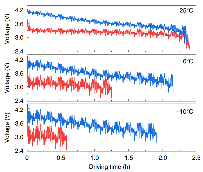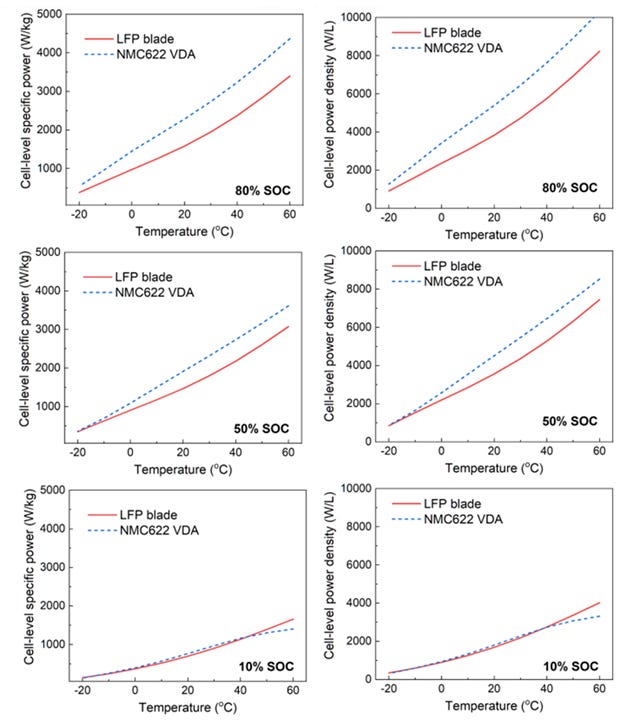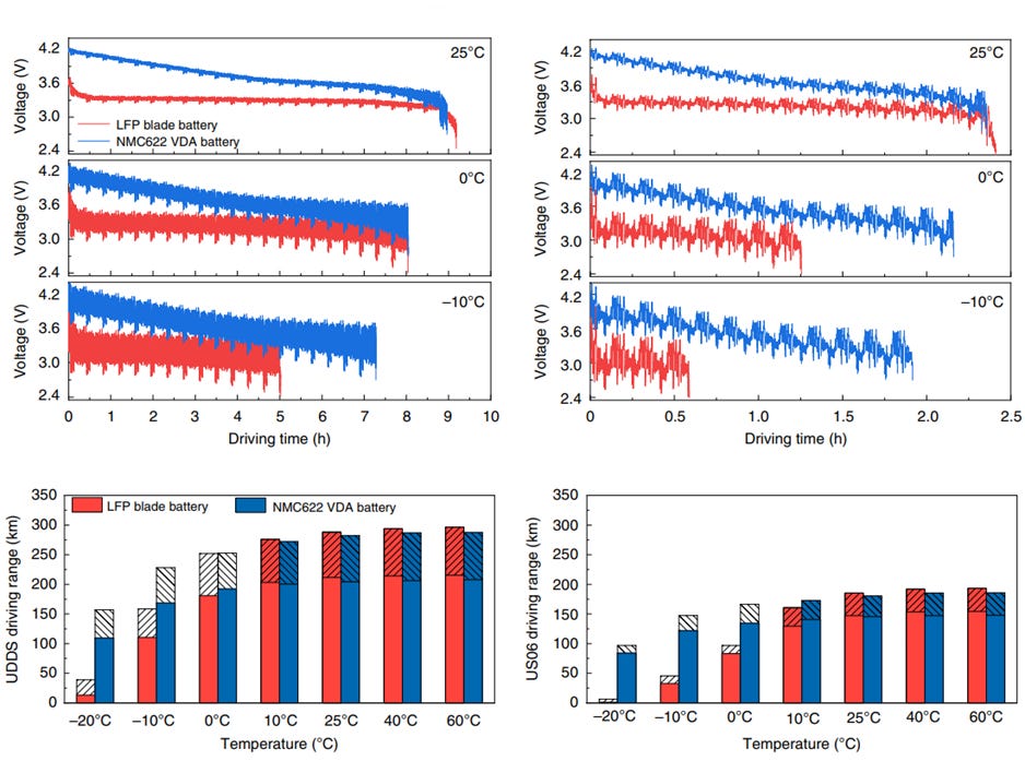 Capacity of the Blade battery is also comparable to that of the VDA NMC622 battery. When both batteries were used in an EV under city-driving scenarios, the Blade battery generally showed comparable driving durations (see Figure 18). However, the performance of the BYD Blade battery was inferior at -10°C - Yang et al. attributed this to the significant drop in ionic diffusivity and electrolyte conductivity for the LFP battery at lower temperatures, hence resulting in higher ionic resistance and greater electrolyte transport resistance. However, Yang et al. also indicated that it is possible to thermally modulate the LFP battery so that performance is comparable to the VDA NMC622 battery.