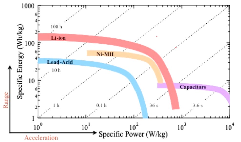 Thirdly, the rate at which a Li-ion cell is discharged (i.e., the power) is inversely correlated with the amount of energy that the cell can provide. The well-known Ragone Plot (Figure 6) illustrates that the higher the power, the lower the amount of energy a battery can provide. The reason for this is that as power increases, heat losses increase, and this reduces the useful amount of energy available.