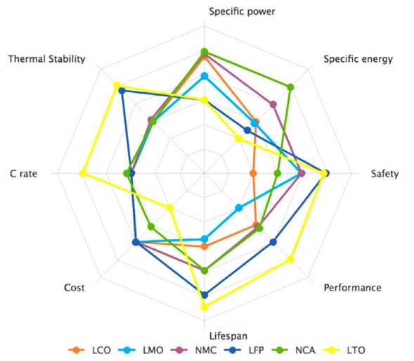 The characteristics of cathode chemistries are often compared on a spider chart such as the one in Figure 14. This shows that nickel-based chemistries (i.e. NMC and NCA) have higher specific energy and specific power than LFP batteries. On the other hand, LFP batteries have better thermal stability and safety.