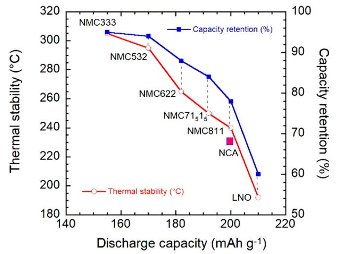 Thermal stability tends to worsen as nickel concentration increases because Ni-O bonds are weaker. Hence, at charging voltages above 4.3V or when operating temperature exceeds 40°C, the Ni-O bond may break and release oxygen. The oxygen may then react with the electrolyte, resulting in exothermic reactions and potentially causing thermal runaway.