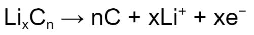 The above reactions are essentially the reverse of the charging process, and the anode is said to be “delithiated”.