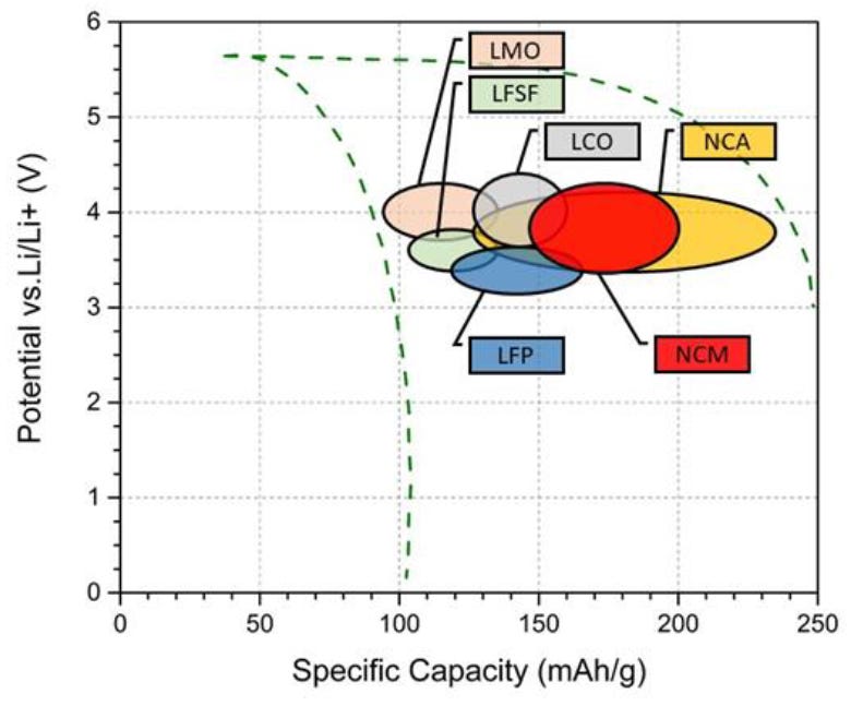 Some of the more common cathode materials are indicated here: