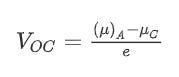 The difference between μA (for the anode) and μC (for the cathode) is the electrochemical potential difference. Dividing this difference by e, the magnitude of the electronic charge, gives the open circuit voltage (VOC) of a cell.