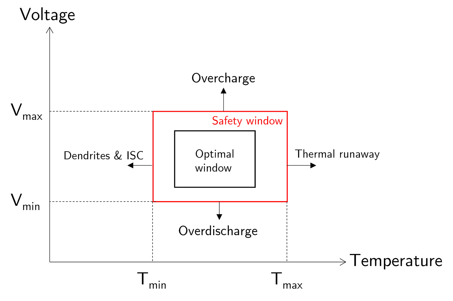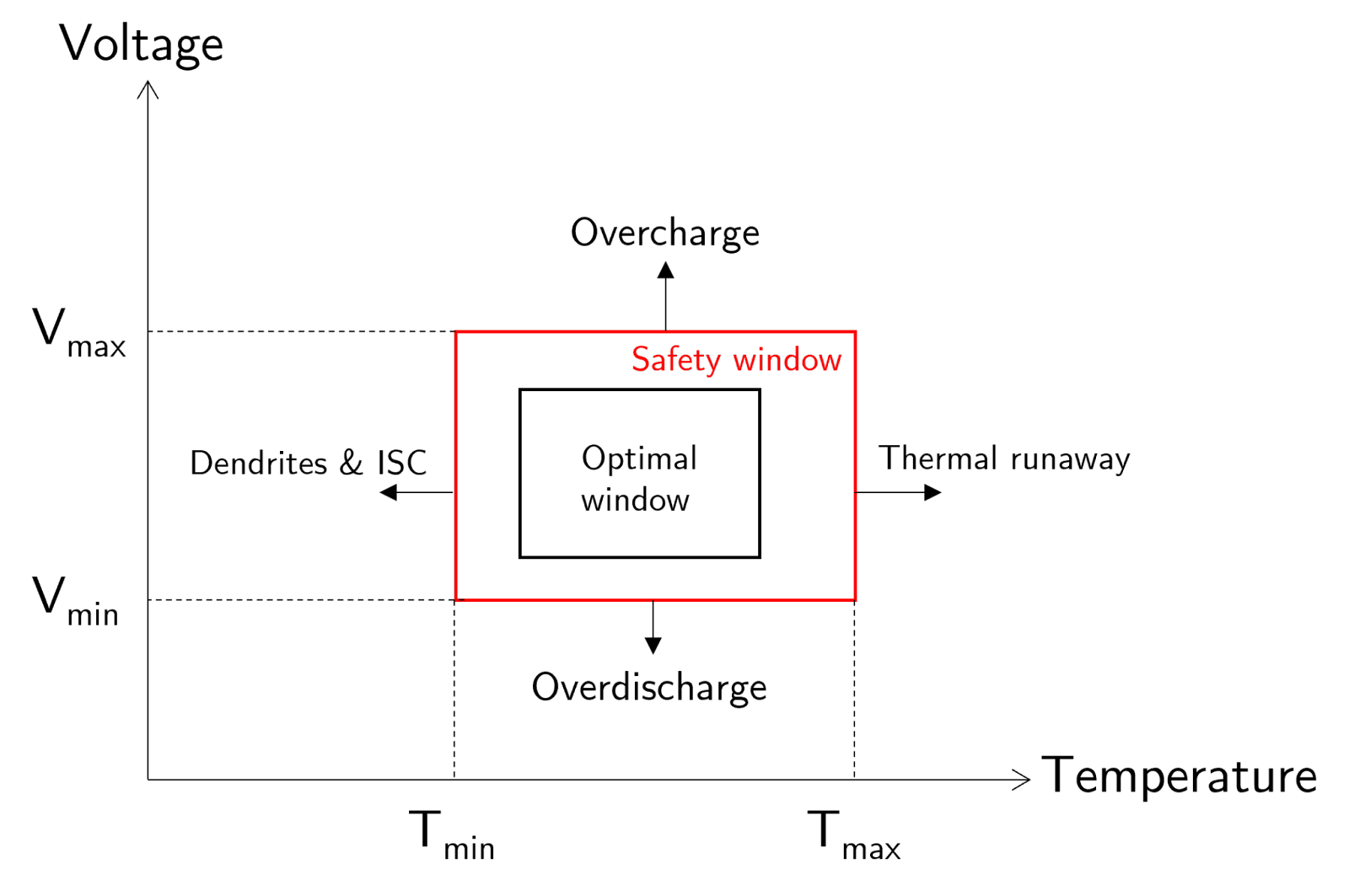 Li-ion batteries should ideally be operated within a certain temperature and voltage range to minimize degradation and reduce the odds of failure. At operating parameters beyond this range, degradation is accelerated and may even lead to catastrophic failure (e.g., thermal runaway).