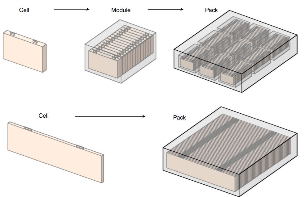 Although modules and packs are typically present in most Li-ion batteries, innovations are occurring that may render the module and/or pack obsolete. For example, companies are starting to embrace cell-to-pack technology (“CTP”) wherein cells are directly integrated into the pack without modules (see Figure 12) - this increases space utilization and hence gravimetric and volumetric energy density at the pack-level.