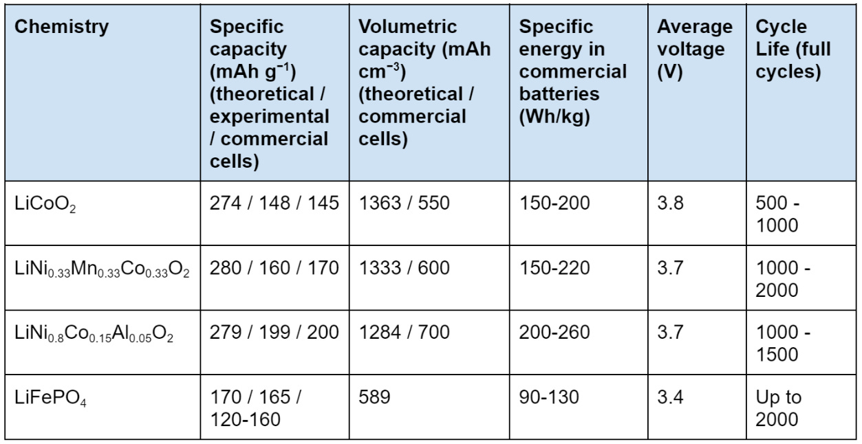 To be more precise, the capacities and specific energies of some of the cathode chemistries above can be summarized in the table below (adapted from Nitta et al., Hu et al. and Zhang et al.):