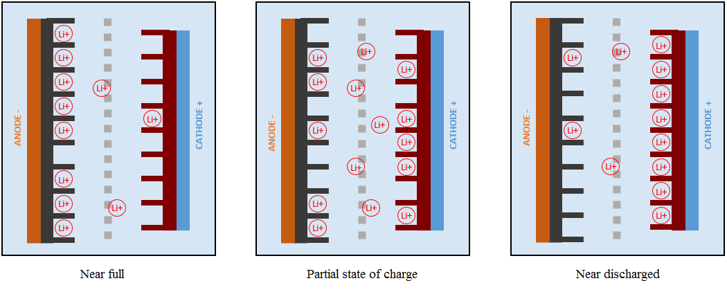 When a Li-ion cell is discharged, lithium ions move from inside the graphite anode, pass through the electrolyte, and then reach the cathode. On the other hand, electrons move from the anode via the external circuit to the cathode.