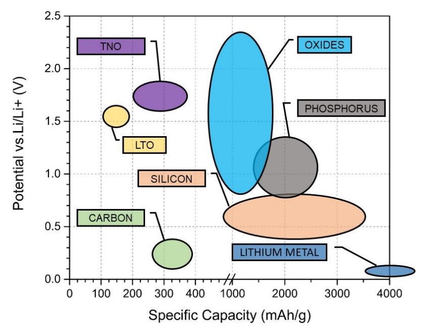 Other materials being explored for anode materials include silicon and lithium metal. While silicon has high specific capacity and a potential that is relatively close to lithium - hence allowing silicon anodes to have high energy density - silicon undergoes huge volume expansions of 270% during the lithiation and delithiation process. As we will explore later, this volume change creates mechanical stress which can lead to electrode fractures. This may expose ‘fresh’ anode surfaces for the SEI layer to form, hence consuming lithium ions and resulting in capacity fade.